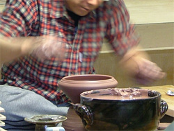 写真は苗代川系の流れを汲む日置市(旧東市来町)美山の沈寿官陶苑で彫りをしている方です。繊細な作業をされていました。白薩摩独特の優美な香炉?でしょうか?他の作業の方も非常に細かい作業を集中してされていました。